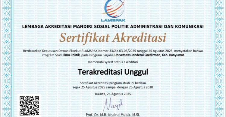 Prodi Sarjana Ilmu Politik FISIP Unsoed berhak menyandang status akreditasi unggul ini sampai dengan 25 Agustus 2030. Keberhasilan mempertahankan status akreditasi unggul merupakan buah dari kerja keras dan kerja sama sivitas akademika Prodi Sarjana Ilmu Politik yang didukung dan difasilitasi oleh pimpinan dan seluruh tenaga kependidikan FISIP Unsoed.